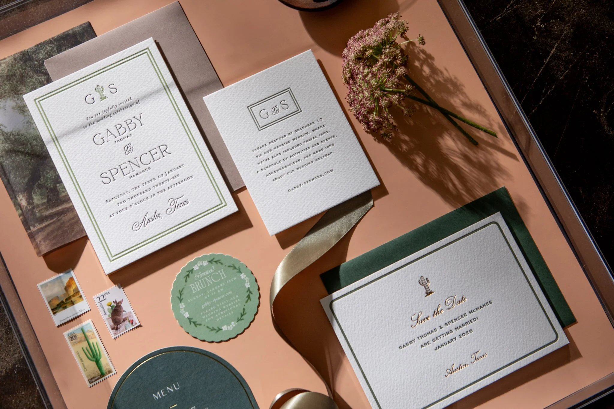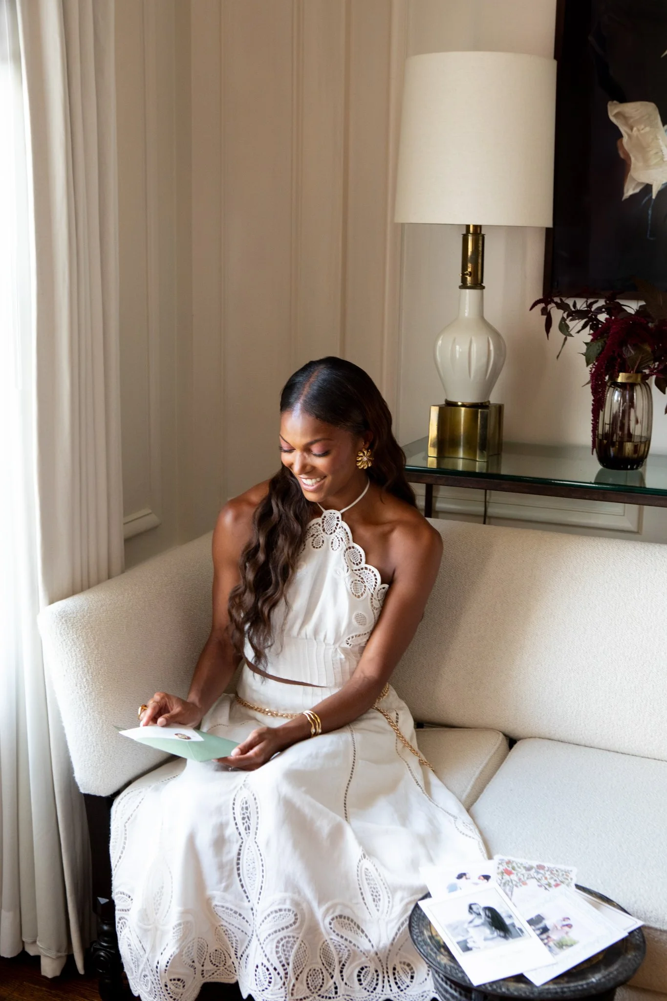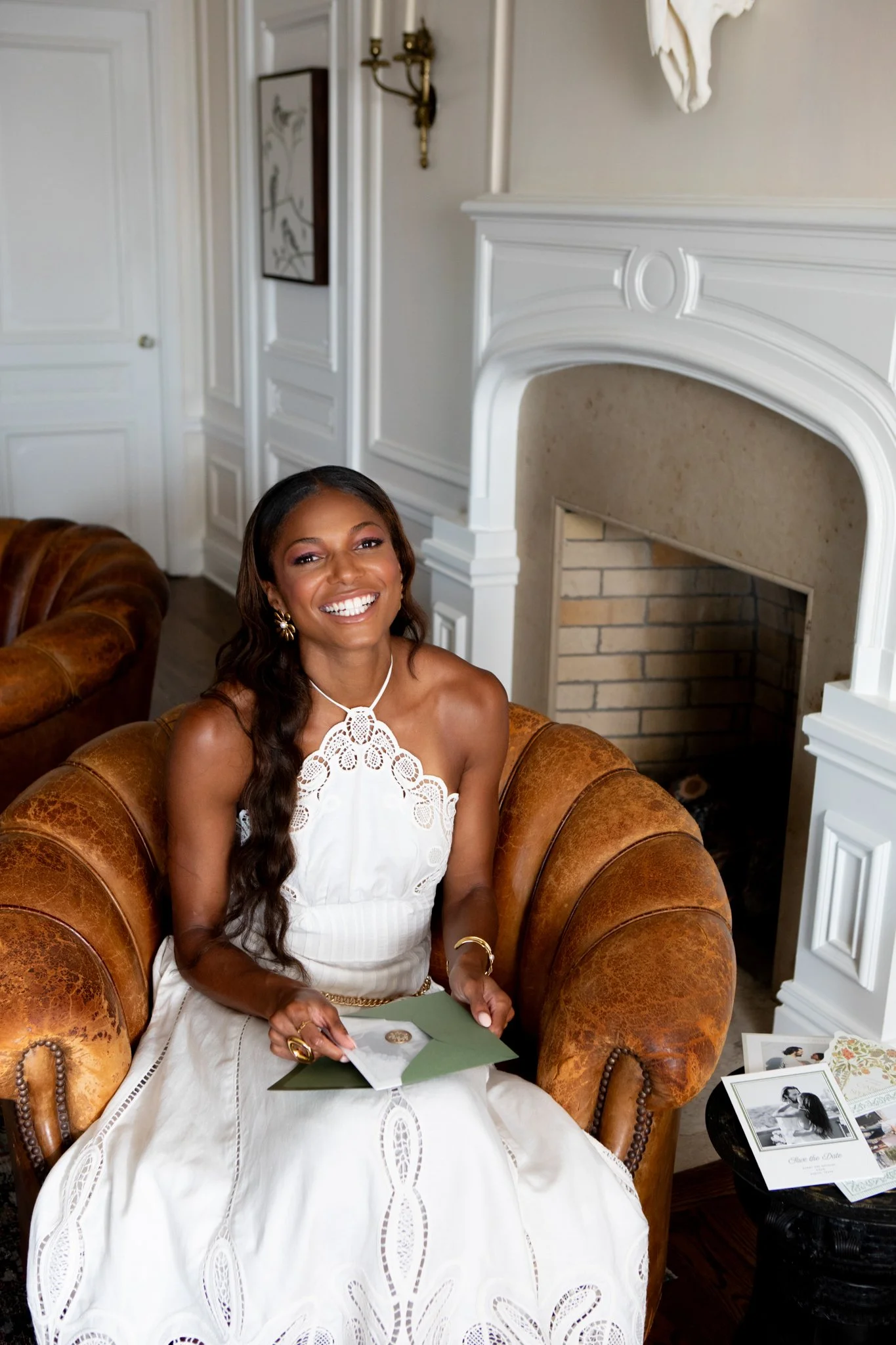 The brief was two worlds in one frame. On one side, Gabby — gold medalist, one of the fastest women alive — in a full bridal gown, moving through the estate's corridors and grounds the way she moves through everything: with complete authority. On the other, Minted's luxury wedding stationery, styled as still life against the estate's textures and light.